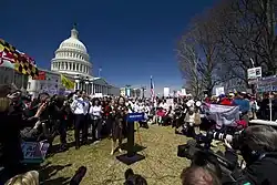 AFP supported the Tea Party movement by obtaining permits and supplying speakers for rallies.[95] AFP helped organize and publicize a "Porkulus"-themed protest on the state capitol steps in Denver, Colorado on February 17, 2009, in conjunction with Obama signing the American Recovery and Reinvestment Act of 2009.[96]: 31 [97] Within hours of CNBC on-air editor Rick Santelli's remarks on February 19, 2009, that criticized the Act and called for a "Chicago tea party," AFP registered and launched the website "TaxDayTeaParty.com," calling for protests against Obama.[96]: 32  AFP had a lead role in organizing Taxpayer Tea Party rallies in Sacramento, Austin, and Madison in April 2009.[15][98] AFP was one of the leading organizers of the September 2009 Taxpayer March on Washington, also known as the "9/12 Tea Party," according to The Guardian.[7] On April 16, 2011, former Republican vice presidential candidate Sarah Palin was the keynote speaker at an AFP annual tax day tea party rally at the state capitol in Madison, Wisconsin.[76][99]