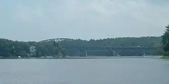 Amesbury is served by two interstate highways. Interstate 495 runs from west to east through town, ending at Interstate 95 just over the Salisbury town line. It has two exits in town, Exit 54 at Massachusetts Route 150 (which lies entirely within Amesbury, and leads to New Hampshire Route 150) and Exit 55 at Massachusetts Route 110, which also provides the town's only direct access to Interstate 95 at Exit 58. I-95 crosses the southeast corner of town, entering along the John Greenleaf Whittier Memorial Bridge, a steel through-truss bridge crossing the Merrimack River. The Whittier Memorial Bridge lies just west of the town's only other bridges across the Merrimack, the Derek S. Hines Memorial Bridge, which connects Amesbury to Deer Island (which is still part of Amesbury), and the Chain Bridge, the only suspension bridge in Massachusetts, which spans from Deer Island to Newburyport. The current version was built in 1909, but was predated by the 1810 suspension bridge, one of the oldest suspension bridges in the country. The Chain Bridge and its counterparts over the years have been the main entryways into town across the Merrimack, and until the building of the Newburyport Turnpike Bridge, it was the easternmost bridge on the Merrimack River.