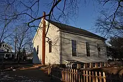 The Amesbury congregation of the Society of Friends is the oldest in northeastern Massachusetts, dating to 1657. Initially meeting in what is now southern New Hampshire to avoid persecution by the Puritan authorities of the Massachusetts Bay Colony, they built their first meeting house in 1705. The present building is their fourth, and was completed in 1851. The poet John Greenleaf Whittier, a member of long standing in the congregation and by then already well known, was a leading force on the building committee. The building's comparatively large size is a reflection of the congregation's importance as a host of the regional quarterly meetings.[2] From 1851 to 1962, the meetinghouse hosted the Salem Quarterly meeting. The Amesbury Monthly Meeting of Friends is a current thriving congregation, with Meeting for Worship every Sunday at 10 AM. The facing bench displays a small plaque that reads, "Whittier's Bench."