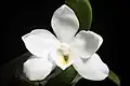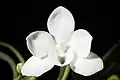These short-stemmed, miniature epiphytes form elliptic, coriaceous, distichous leaves. White flowers with pronounces spurs, indicating moth pollination, are formed on short, axillary racemes. [4]