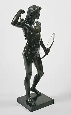 Two American sculptors who enjoyed great success during their lifetimes, Frederick MacMonnies (1863–1937) and Augustus Saint-Gaudens (1848–1907), are represented in the Carter collection by cast bronze works created in the late nineteenth century. Alexander Phimister Proctor (1860–1950) and Anna Hyatt Huntington (1876–1973) are represented by bronzes created in the late nineteenth and early twentieth centuries respectively. A bronze sculpture by Solon Borglum (1868–1922), who, like Remington and Russell, specialized in depictions of Old West subjects, and a two-piece bronze by Paul Manship (1885–1966), Indian Hunter and Pronghorn Antelope (1914), are in the collection as well.