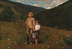 Nineteenth-century figure paintings, portraits, and genre pictures (portrayals of everyday life) represent an important chapter in the history of American art development, and several examples of these types of paintings are found in the Carter collection. Swimming (1885) by Thomas Eakins (1844–1916) is one of the best-known realist figure paintings in the history of American art.[17] A summation of Eakins' painting technique and belief system, Swimming was acquired for the Carter collection in 1990.[18] Crossing the Pasture (1871–72) by Winslow Homer (acquired 1976) combines the artist's skills as a figure painter with his gift for storytelling to create a charming image of rural New York life.
