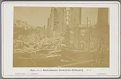 In the night from 8 to 9 September 1874 the sugar refinery Java burnt down. After the fire had started on one of the upper floors at about 1 o'clock at night, it proved unstoppable. The fire department could not do much more than save the office building and other surrounding structures. The buildings were insured for 750,000 guilders, the stock for 600,000, and the annexes for 70,000 guilders. 320 employees lost their job.[47] The bookshop of C.F. Stemler published some photographs of the fire. The sale was one of many initiatives to support the employees who suddenly did not have any income.[48]