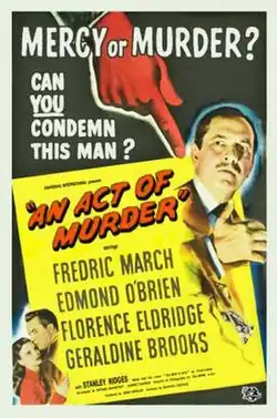 An Act of Murder is a 1948 American film noir directed by Michael Gordon and starring Fredric March, Edmond O'Brien, Florence Eldridge and Geraldine Brooks.[2] It was based on a novel by the Austrian writer Ernst Lothar. The film was produced and distributed by Universal Pictures. It was entered into the 1949 Cannes Film Festival.[3] It is also known by the alternative titles Live Today for Tomorrow and I Stand Accused.[4]