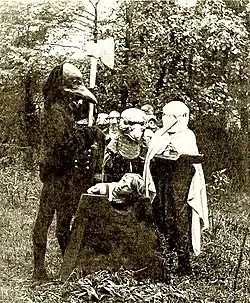 An Old-Time Nightmare is a lost 1911 American silent fantasy comedy film. Directed by Fred Walton, the short was released as the latter half of a 1000-foot "split reel", with the first half being another comedy short, Lost in a Hotel.[5][1] Both films were produced by the Powers Moving Picture Company of New York. This short's performers are not credited in 1911 reviews, in plot summaries, or in advertisements published in trade journals at the time. The faces of most of the cast were not visible on screen, for many of the actors wore costumes with full head coverings sculpted to resemble various species of birds, including a sparrow, eagle, dove, owl, wren, stork, bluebird, robin, linnet, and crow. While the short was identified upon its release as a comedy, it was also characterized in several contemporary reviews as a morality lesson and ideal photoplay for "juvenile" audiences.[6]
