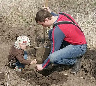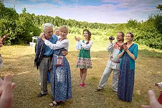 According to Anastasians themselves, the movement is contributing to the improvement of the demography of Russia in both quality and quantity, as in Anastasian ancestral settlements "conditions are created for the birth, feeding and upbringing of children in favorable conditions for them", so that "the quality of upbringing and education of the younger generation is improving".[54] According to some observers, the Anastasian system of kinship homesteads has also provided a solution to Russia's housing problems.[118] Pozanenko observed that the inhabitants of the Anastasian settlements that he studied are for three fourths members of the "urban intelligentsia with higher education", with 75% of them having graduated from university, a majority in technical and natural sciences, and others in humanities.[119] Single people are extremely rare among Anastasian settlers, as they are often refused admission since they risk not continuing the kinship line, not taking root and not becoming attached to the place.[108] On the other hand, large families are encouraged, and Pozanenko noted that the birth rate in Anastasian villages "is definitely higher than in the whole country".[91] It is common for Anastasian couples to be united according to old Slavic wedding ceremonies which remain unregistered with the state.[108] Some Anastasians bury their dead directly in their own plot of land, planting a tree over the grave to symbolise the rebirth of the deceased; nothing is intended to remain of the burial.[68] They do so believing that public cemeteries are only for the lonely and vagabonds, and this often causes the indignation of the authorities and the misunderstanding of the inhabitants of nearby non-Anastasian villages.[68]