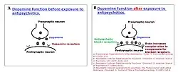 A symbolic graphic of the brain's dopamine function before and after antipsychotics