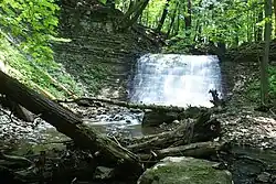 In an age before steam power, the wilderness that would become Ancaster had an early economic advantage because it existed amidst a natural break in the Niagara Escarpment. Thus, even its relatively minor water resources were valuable because they were easily accessible. Just as vital an influence in Ancaster's rapid development was that it already had access to two crucial prehistoric First Nations roads. The first European settlers to set foot in this region would have encountered the Iroquois Trail and the Mohawk Trail intersecting precisely in the area that would eventually become Ancaster Village. This aboriginal Iroquois trail had become the most critical transportation route in Upper Canada. It meandered down the escarpment from the future Ancaster into what would eventually become Hamilton, Ontario, towards present-day Lewiston, New York, eventually linking up with similar aboriginal trails in New York. In the other direction, the Iroquois trail led from present-day Ancaster to what would eventually become the town of Brantford, Ontario, at which point the trail branched off into the Detroit Path and the Long Point trail. By 1770, the 80-kilometre Mohawk Trail was essentially the escarpment accompaniment of the lakeside Iroquois trail. The Mohawk Trail ran parallel to the Iroquois Trail. It originated and diverged from the Iroquois Trail in present-day Queenston, Ontario, until finally ending and reconnecting to the Iroquois Trail in present-day Ancaster at what is now known as the intersection of Rousseaux and Wilson Street. The two trails had been interconnected in four locations along the Mohawk Trail's 80-kilometre route when favourable escarpment conditions permitted. By 1785, the Iroquois Trail passing through present-day Ancaster had been widened to accommodate horse and buggy traffic. Another influential road that intersected the Mohawk Trail very close to Ancaster Village was the Twenty Mile Road that followed the Twenty Mile Creek up to present day Smithville, Ontario, and beyond.[7] Lastly, Ancaster also had fertile soil and abundant fresh water, which encouraged pioneer settlers to arrive in this region to clear the land and plant crops for subsistence agriculture.