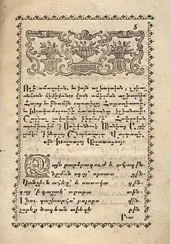 The social-political and cultural upheaval that began in the first half of the 17th century also affected literary literature. Alongside the development of the art of copying ancient manuscripts, printing, and folklore, new literary values were created.[203] At the same time, due to the political situation, the changes of the new era slowly penetrated into Armenia. The 17th-18th centuries essentially continued and completed medieval literature.[13] At this time, the ideology of the Armenian national liberation movement and the bourgeois trade was also forming. Lyrics remained the leading literary genre. According to Henrikh Bakhchinyan, the three main directions of its development were religious-patriotic poetry, secular poetry, and folk gusan songs. Despite their unique features, these directions were not strictly differentiated and represented mutual influences within the framework of the unified artistic thinking of that time. Sometimes in the works of one author, one can see different poetic directions of the era. In this sense, the creativity of Martiros Ghrimetsi from "The Armenian Grimoire," combining religious hymns, secular poetry, and pastoral poetry, is characteristic.[204] As noticed by S. La Porta, the opposition between religious and secular literature represents a false dichotomy: "Instead, they should be seen as brothers and sisters sharing one destiny".[205] All dominant tendencies reflected literary continuity with subsequent linguistic-poetic properties, themes, and directions. For example, religious-patriotic poetry repeated and developed a similar medieval tradition. Its language was mainly grabar, sometimes Middle Armenian, and the themes were taken from the Bible or Armenian history. It had enlightenment goals, with the audience mainly being future leaders and enlighteners of the church. In turn, religious-patriotic poetry is divided into three parts: purely religious, national-church, and historical-political. Purely religious poetry lagged behind in its artistic qualities compared to similar medieval works, which was a consequence of the dominance of religious ideals over secular ones in the modern era. However, religious poetry acquired a greater social mission. National-church poetry of the 18th century gained particular weight, synthesizing biblical and Armenian national plots. Historical-political poetry, reflecting the military past and present of the Armenian people, its liberation aspirations, also developed.[204] Most poets of the 17th century were representatives of the common people, which largely determined the ideological aspect of their literature.[88] Secular themes and thematic diversity predominated in literature as a whole.[206]