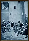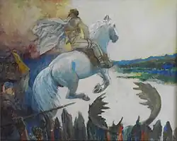 Horymír on horse Šemík jumps from a rock on Vyšehrad