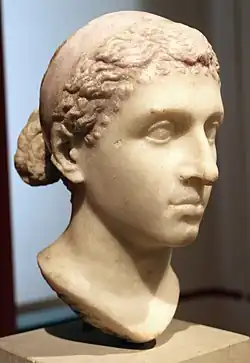 Cleopatra's official coinage (which she would have approved) and the three portrait busts of her which are considered authentic by scholars, all match each other, and they portray Cleopatra as a Greek woman.[125][126][127][128][129] Polo writes that Cleopatra's coinage presents her image with certainty, and asserts that the sculpted portrait of the "Berlin Cleopatra" head is confirmed as having a similar profile.[126] Similar to the Berlin Cleopatra, other Roman sculpted portraits of Cleopatra include diadem-wearing marble heads now located in the Vatican Museums and Archaeological Museum of Cherchell, although the latter may instead be a depiction of her daughter Cleopatra Selene II.[130][131][132] Aside from Hellenistic art, native Egyptian artworks of Cleopatra include the Bust of Cleopatra in the Royal Ontario Museum,[133] as well as stone-carved reliefs of the Temple of Hathor in the Dendera Temple complex in Egypt depicting Cleopatra and Caesarion as ruling pharaohs providing offerings to Egyptian deities.[134][135] In his Kleopatra und die Caesaren (2006), Bernard Andreae contends that this Egyptian basalt statue is like other idealized Egyptian portraits of the queen, and does not contain realistic facial features and hence adds little to the knowledge of Cleopatra's appearance.[136]