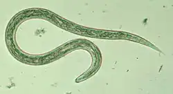 Ancylostoma duodenale is a species of the roundworm genus Ancylostoma. It is a parasitic nematode worm and commonly known as the Old World hookworm. It lives in the small intestine especially the jejunum of definitive hosts, generally humans,[2]: 307–308 [3] where it is able to mate and mature. Ancylostoma duodenale and Necator americanus are the two human hookworm species that are normally discussed together as the cause of hookworm infection. They are dioecious.[4] Ancylostoma duodenale is abundant throughout the world, including Southern Europe, North Africa, India, China, Southeast Asia, some areas in the United States, the Caribbean, and South America.