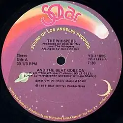 "And the Beat Goes On" is a 1979 single by the American music group the Whispers.[3] The song was their first of two number-one singles on the Soul chart, and their first Top 20 hit on the Billboard Hot 100, peaking at number 19.[4] "And the Beat Goes On" was the group's only number-one song on the dance chart.[5] It was also their first and biggest hit in the United Kingdom, peaking at number 2 on the UK Singles Chart. The song also peaked at number 27 on the Canadian RPM chart and was in the Canadian Top 100 for 21 weeks.[6]