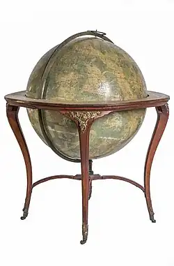 Contentwise, the terrestrial globes were made using mainly maps available to Åkerman in the collections of Uppsala University Library, including by cartographers Jean-Baptiste Bourguignon d'Anville and Jacques-Nicolas Bellin. Information obtained from travelogues of recent voyages by George Anson and Charles Marie de La Condamine were also used as sources.[12] Åkerman's first celestial globes were made with the aid of the star catalogues by John Flamsteed and Nicolas-Louis de Lacaille.[22] Åkerman had close contacts with the members of the cosmographic society, not least Mallet, who had a more thorough scientific knowledge and helped Åkerman to produce accurate globes.[23] The globes were made of papier-mâché, which was covered in a layer of gypsum and then polished before engraved strips were applied to form the face of the globe.[7] The larger globes, intended to be placed on the floor, were fitted in stands made in a Rococo style, painted red and decorated with brass details.[24] One pair, made for the Royal Swedish Academy of Sciences, was fitted to a custom-made stand by the royal cabinetmaker Lars Almgren.[25] The smaller globes were given simpler stands.[26]