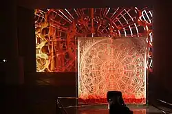 A 2013 exhibition by Molodkin in the Void Gallery in Derry entitled 'Catholic Blood' was created specifically for the context of Derry and Northern Ireland. 'Catholic Blood' tapped into contentious historical divides in Ireland, as its subject is based in the Roman Catholic Relief Act 1829 and a particular clause of the British constitution that reportedly forbids any MP from advising the sovereign on ecclesiastical matters if they are of the Catholic faith, though this was disputed by Dr Bob Morris, an expert in constitutional affairs at University College London. Molodkin correctly asserted, "Yes, but there have been no Catholic prime ministers, perhaps when we talk about it we will get one."[10][11][12] The work was controversial in its choice of materials which consisted of blood donated by local Catholics, a specification that was met with resistance.[13] The project required the participation of the public, thirty-six people came forward to donate their blood, including the son of a Catholic Priest.[13] The piece was constructed from hollowed acrylic blocks, mirroring the rose window of the Palace of Westminster.[11][13] A pharmaceutical fridge contained samples of donated human blood and an industrial compressor pumped this blood through the cavity of the rose window in the acrylic block. This was simultaneously filmed and projected onto the gallery walls. Molodkin, reflecting on the exhibition and the vociferous reaction, stated: "Some people were angry that I hadn't used both Catholic and Protestant blood. They felt cheated that I had only chosen to use Catholic blood. It was never my intention to mix religions – the intensity is in the separation.[13]
