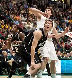 During his sophomore year, Smith played in all 38 games, starting 32.[2] After Butler got off to a mediocre 3–2 start, Smith was added to the starting lineup.[1] Against Cleveland State, he scored a career-high 22 points and collected 10 rebounds to get his first collegiate double-double. In the final game of the regular season, he played a career-high 36 minutes and recorded 11 rebounds, 3 steals, and 3 blocks, all career highs.[2] Thanks in large part to Smith's emergence as a starter, Butler returned to the NCAA Tournament.[4] During the round of 32, Smith hit a go-ahead basket with less than 3 seconds on the clock to help Butler beat top seeded Pittsburgh.[2] In Butler's sweet 16 match against Wisconsin, Smith hurt his ankle and left the game.[4] However, he returned before the game's end, collecting eight points and six rebounds as Butler advanced to the regional final.[4] Butler again advanced to the Championship game. Smith led the team in rebounding in the regional final against Florida and in the National Championship game against Connecticut.[2] He finished the year as the team's second-leading rebounder (5.6 per game) and third-leading scorer (8.5).[2][7] He made 59.3% of his field goal attempts and 67.3% of his free throws.[7]
