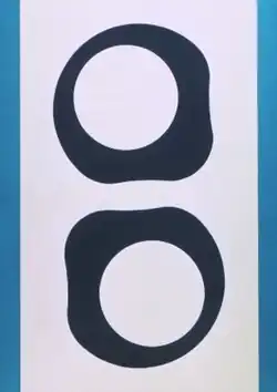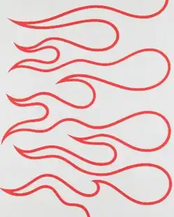 In the 1980s, Spence moved away from a rectilinear vocabulary, incorporating arcs, spirals and triangles and biomorphic shapes into his work.[36][5] His images initially consisted of singular, iconic images in limited colors that were embedded in heavily textured surfaces and read like graphic language symbols or fragments of advertising logos.[24][36] As the decade progressed, he turned increasingly to tongue-in-cheek, schematic renderings of common objects and architecture or modernist furniture (e.g., Light, 1987), whose inspirations and eccentric perspectival views (often overhead) only became apparent through the picture titles.[24][30][6] For example, Swivel Chairs (1988) drew on the well-known Eames armchair design, while Blue Canoe (1988) presented a field of horizontal stripes, two of which were blue and altered to mimic half-canoe shapes.[7][9]