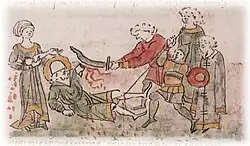 However, the Radziwiłł Chronicle's adjoining miniature depicts his assailants cutting off his left arm.[30] Moreover, when Dmitry Gerasimovich Rokhlin examined the exhumed body of Andrey Bogolyubsky in 1965, he "found a lot of cut marks on the left humerus and forearm bones".[31] A 2009 special historical study by Russian historian A.V. Artcikhovsky (2009) would later confirm Rokhlin's observations.[31]