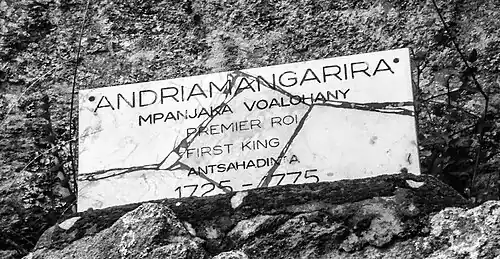 Andriamangarira was a king from the Merina Kingdom in Madagascar. He founded the royal city of Antsahadinta in around 1725. He was the grandson of King Andriamasinavalona,[1][2][3][4] son of Rasohanamanjaka of Ambohimahamanina, one of his daughters, with a certain Andriandambozozoro, Lord of Ivatobe avaratra and Malaza in Ambodirano Imerinatsimo. The tomb of Andriamangarira, qualified as a « Pirogue grave », and his « Tranomasina » (Sacred House) according to traditions, are still visible in Antsahadinta.[5]