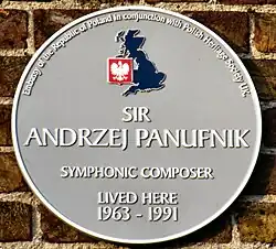 - ^ "Unveiling of a plaque commemorating the Centenary of Sir Andrzej Panufnik - September 2014". The Polish Heritage Society. 2014.
