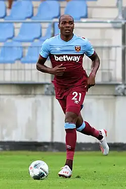 On 10 July 2015, Ogbonna joined Premier League club West Ham United, on a four-year contract, for €11 million to be spread over the next three financial years.[14][15] He made his debut 20 days later in the Europa League third qualifying round, starting against Astra Giurgiu; in the 82nd minute he netted an own goal equaliser as West Ham drew 2–2 at the Boleyn Ground.[16] On 9 February 2016, Ogbonna scored his first goal for the club, netting an injury-time match-winning header in the 121st minute of a 2–1 home win over Liverpool, in the fourth round FA Cup replay.[17] Having played 18 of a possible 22 Premier League games for West Ham in the 2016–17 season, he was ruled out for the remainder of the season as he required an operation. West Ham manager, Slaven Bilić, said that Ogbonna had played every game of the season despite carrying the injury.[18] He returned for the final game of the 2016–17 season, a 2–1 away win against Burnley.[19] In June 2017, Ogbonna signed a new contract with West Ham committing him to the club until 2022.[20]