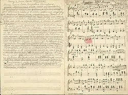 In 1900, Chertkova wrote "A Practical Textbook of the English Language, Intended for Russian Settlers in America".[30] She compiled a collection of various religious hymns by Russian sectarians: "A Collection of Songs and Hymns of Free Christians" (1904-1905, three editions). In the preface, Chertkova noted that some of the published texts actually belonged to free Christians, while others were "intended to satisfy their needs" for "spiritual songs" that corresponded to their "understanding of life"; thus, many of the texts were actually written by Russian poets such as Alexey Tolstoy, Alexander Pushkin and Alexey Khomyakov, and the melodies were taken from Russian folklore or works by well-known Western composers such as Ludwig van Beethoven and Frederic Chopin; the songs were published in a two-handed version for voice and clavichord).[31] Another collection compiled by Chertkova was "What Russian Sectarians Sing" (three editions, 1910 - 1912, containing authentic songs of Russian sectarians; Cherkova said she obtained their approval of each recording by performing the music herself in their presence), She published psalms and "verses" of the Dukhobors in the first edition, "psalms" of the Malyovans in the second edition, and songs of the Yakut sectarians, Oskoptsy, Molokans, Dobrolubovians, and "Old Israel" in the third edition).[32] Another collection was of songs and canons was called "Melodies" (in four editions, ca. 1910), Rural Sounds (c. 1910), and "The Sower" (1922). She also published her own recording of the folk song "About Moscow in 1812" (1912); she became the author of the words and music for the songs "Listen to the Word, the Dawn is Breaking" and "The Day of Freedom is Coming" popular among the "Tolstoyans".[3][33][Note 6]