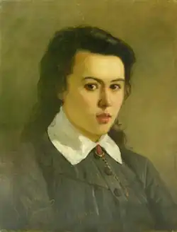 Anna Chertkova was portrayed by Nikolai Yaroshenko in the painting "Student", created in 1883. A version of this painting is kept in the collection and exposition of the Kaluga Fine Arts Museum (inventory Ж 0167).[66] Oilpainting over linen. Its dimensions are 131 × 81 cm.[67] A variant of the painting, which is in the collection and exposition of the National Museum "Kiev Art Gallery" (inventory Ж-154),[68] is made in the same technique. Its size is 133 × 82,5 cm (according to other data - 134 × 83 cm).[68] It is signed: "N. Yaroshenko 1883".[67]