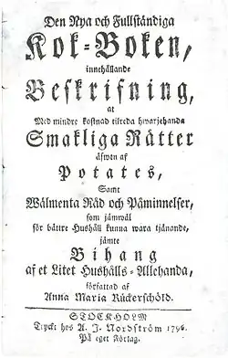 In 1785, fifteen years after she wrote her plea for female household education, Rückerschöld published En Liten Hushålls-Bok ( "A Small Household Book"). It was published in her own name, and contains various practical advice on efficient household management; cooking, cleaning, washing, brewing, butchering, etc. Rückerschöld was influenced by the mercantilistic economic ideas of her time, and advised readers to take better advantage of local produce, such as berries and mushrooms and using locally available products in favor of imports, such as substitution of wine with juice or vinegar made from homegrown fruit. There are few actual recipes for cooking, and all of them describe more everyday dishes such as simpler porridge and soup. For more refined cooking, Rückerschöld recommended other contemporary cookbooks, of which Cajsa Warg's is described as the foremost.[9]