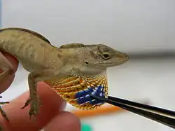 Most—but not all—anole species have dewlaps, made of erectile cartilage (modified from the hyoid) and covered in skin, that extend from their throat areas. When not in use and closed it lies inconspicuously along the throat and chest. The size, shape, color and pattern of the dewlap vary extensively depending on species, and often it differs between the sexes, being smaller (in some absent) or less colorful in females.[7][8][90][91] In a few species, including the Carolina, bark, Cochran's gianthead and slender anoles, it varies geographically in color depending on subspecies or morph.[92][93][94][95] Very locally, distinct morphs of a single species that differ in dewlap colors (not just differences between sexes) may occur together.[95] In addition to colors that are visible to humans, dewlaps can have ultraviolet reflectance, which is visible to anoles.[90] The striped anole is the only species where it is asymmetrically colored, being brighter on one side than the other.[96] In some species even juveniles have a dewlap.[97][98] The West Cuban and Cuban stream anoles are the only where both sexes lack a dewlap, but it is reduced and diminutive in about a dozen other species.[2][91][99]