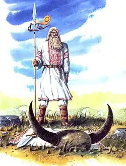 Although the Antes are regarded as a predominantly Slavic tribal union, numerous other theories of their ethnic components have arisen. The origins of their core ruling class have drawn particular attention, including theories that this ruling nobility was ethnically Iranic, Gothic, Slavic, or some mixture thereof.[8] Much of this dispute has arisen from the scantness of the literary evidence: little is known of the Antes apart from the tribal name itself and a handful of anthroponyms. The name Antes itself does not appear to be Slavic, and is often held to be an Iranian word.[9] Omeljan Pritsak, citing Max Vasmer, argues that because anta- means "frontier, end" in Sanskrit, *ant-ya could mean "frontiersman"[10] or "that which is at the end"; and in Ossetian att'iya means "the last, behind".[11] F.P. Filin and Oleg Trubachyov[12] shared this opinion. In contrast, Bohdan Struminskyj considered the etymology of Antes unproven and "irrelevant".[13] Struminskyj analyzed the personal names of Antean chiefs and offered Germanic etymological alternatives to the commonly accepted Slavic etymologies that had first been proposed by Stanisław Rospond.[14]
