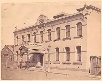 Anthony Hordern sen. (1788–1869) came from Staffordshire, where his family was prominent in Wolverhampton banking circles.[2] He and his wife Ann (ca.1791–1871) and four children arrived in Sydney on the Phoenix on 6 August 1823 (one reference has 16 June 1824)[3] and set up a drapery business "Mrs. Hordern's" at 12 King Street, between Pitt and Castlereagh Streets[4] on the eastern corner of Terry Lane (later Truth Lane);[2] (He may have initially set up as a coachbuilder.) An advertisement for her shop in the Sydney Morning Herald of 3 April 1834, is said to have been the first display advertisement in any Australian newspaper.[5] They moved to Melbourne in 1839,[6] and Anthony jun. (1819–1876) found employment as a cabinetmaker, but was shortly to return to Sydney.[2] Anthony Hordern senior remained in Melbourne, living at 86 Russell Street. His son William (1831–1881) also remained in Melbourne.