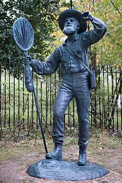 Upon graduating in 2005, he set up a studio in Cambridge[7] and began sculpting full-time, specialising in wildlife and human figure subjects. His first major commission came in 2007, when he sculpted a portrait bust of Carl Linnaeus for the Linnean Society of London, commemorating the 300th anniversary of Linnaeus's birth.[8] Other commissions soon followed, including a portrait bust of the famous author the James Bond novels, Ian Fleming.[1] His first life-sized statue was commissioned for his old Cambridge College in 2009 to commemorate the bicentenary of its most famous alumnus, Charles Darwin. Smith was inspired to study zoology after first reading On the Origin of Species at the age of sixteen, and he was keen to depict Darwin as a young man, in contrast to the more common depiction of him as an elderly, bearded gentleman, as he was in later life.[9] The life-sized statue was unveiled by Prince Philip, Duke of Edinburgh (then-Chancellor of the University) and was subsequently shortlisted for the Marsh Award for Excellence in Public Sculpture 2009.[10]