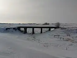 An abandoned CPR trestle over a frozen Antler River in Saskatchewan