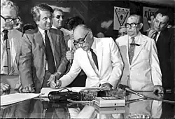 Alegre signing as new president of Boca Juniors in 1985. On the left, interventor Federico Pollack. At right, former president and candidate Alberto J. Armando