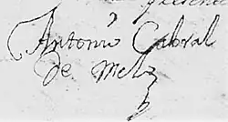 In 1707, Antonio Cabral de Melo gave the power to write his will to Miguel de Riglos, a personal friend of the Cabral de Melo family. Miguel de Riglos was the nephew of Manuel Cabral de Alpoim, a prominent rancher and military leader of Portuguese origin, who had a distinguished career in the Río de la Plata, where he served as Mayor and Lieutenant Governor of Corrientes.[14]