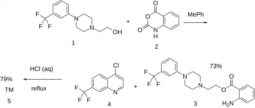 Method G: Alkylation with 4-chloro-7-(trifluoromethyl)quinoline [346-55-4] (4) completed the synthesis of antrafenine (5).