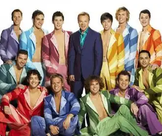 Graham Norton and the twelve contestants each wearing their 'dreamcoat', symbolically handed back once they were eliminated. Those pictured are (clockwise from top left) Chris B, Antony, Chris C, host Graham Norton, Keith, Lewis, Ben, Johndeep, Daniel, Seamus, Craig, Lee and Rob.