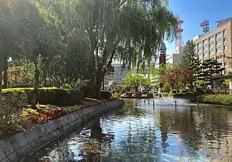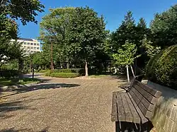 The park lies in the otherwise dense administrative district of Aomori.[1] It is surrounded to the west, north, and south by office buildings, made primarily up of administrative buildings for the government of Aomori Prefecture. Its boundaries are marked by city streets, though its southern boundary is formed by National Route 4 and National Route 7.[2] These highways have their northern end points at the park, this is detailed on several markers and monuments within the park.[3]