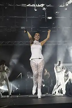 After a few months of preparation, her concert at the Cemil Topuzlu Open-Air Theatre in Harbiye occurred on 11 August. For the opening act, she performed the song "İnsanlar Çok" and used images from the Arab–Israeli conflict and the Iraq War in the background.[68] Yener appeared on the stage alongside dancers from the contest Benimle Dans Eder misin?, and again performed the song "Apayrı" together with Ege Çubukçu.[69] Instead of an orchestra, which was on stage in her previous concerts, two DJ mixers and Macintosh computers were used at the Harbiye concert, and Yener performed her songs with electronic mixes.[70] On 9 September, she gave a concert at Rumelihisarı.[71]