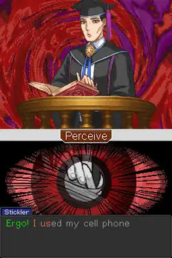 The trial portions consist of listening to and cross-examining witness testimonies. The player is given the option to either Press or Present evidence in response to statements made by witnesses.[7] The player can either select their choice or yell into the microphone.[8] By choosing Press, the player questions the witness's statement, which sometimes causes the witness to change their testimony. When finding inconsistencies in the testimony, the player may choose Present in order to show a piece of evidence that they think contradicts the testimony.[9] The player has a health bar, representing the judge's patience. If the player presents incorrect pieces of evidence or choose incorrect answers to questions in court, health is lost. If the health bar reaches zero, the player loses the game and their client is declared guilty.[10] A new system, known as the "Perceive System," can be used to look for motions or actions made by witnesses that show nervousness, similar to a tell in poker.[11] The game also includes a "Crime Recreation Mode" that models evidence or the crime scene in a 3-D rendition and allow the player to explore the recreation to look for clues. Additionally, the game often recreates the crime in cutscene sequences, allowing the player to observe the action and find contradictions.[12]