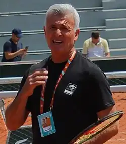 Tsitsipas married the tennis player Julia Salnikova in 1991 after meeting her while working as a line judge at a Women's Tennis Association (WTA) tournament in Athens.[5][6] He traveled with her on tour, then studied tennis coaching in Vienna and Berlin for several years, before moving back to Athens to work as a tennis instructor.[4] He and Julia trained Stefanos, their first child, from the age of three.[4] As Stefanos began to find success as a junior, Tsitsipas left a high school teaching position to travel with his son full-time from age 11 or 12.[4][7][8] He played occasionally on the ITF Seniors Tour from 2003 to 2010, achieving a peak ranking of No. 310 in 2006.[9] He served as the captain of the Greek contingent at the ATP Cup (2020–2022).[10]