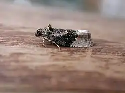 The wingspan is 16–20 mm. The forewings are white, sometimes partly ochreous - tinged, with some grey striae posteriorly. The basal patch and central fascia are dark brown, black -marked, the included space dark ashy-fuscous, all slightly whitish sprinkled, on fold sometimes more mixed with white. The posterior edge of fascia is nearly straight, followed in middle by a faint pinkish-ochreous tinge. Hindwings grey, darker posteriorly. The larva is green, incisions yellowish; dorsal and subdorsal lines grey-green; tubercular spots yellow; head yellow-green; plate of 2 pale green.[2] Julius von Kennel provides a full description.[3]