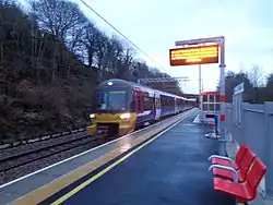 The new station has a free car park, bicycle rungs and a bus terminus. There is an automated ticket machine at the station entrance. Both platforms, in-line with the Disability Discrimination Act, are accessible by wheelchair via ramps.[19] Both platforms have an unheated shelter and digital information screens. A new set of traffic lights manages traffic at the entrance to the station car park.
