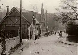 The Leeds and Bradford Railway opened on 30 June 1846. At first, there were no intermediate stations. Temporary stations were provided, including Apperley Bridge, which opened some time during July 1846.[1] A permanent structure followed about a year later. It comprised two platforms, partly covered by an overall roof. The main building ran parallel to the railway on the south side up at road level. A principal customer was Woodhouse Grove School, whose land had been crossed by the Railway. About 1849, the railway agreed to purchase gas from the school to light the station.