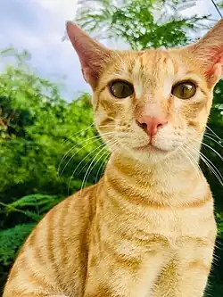 The Arabian Mau is a formal breed of domestic cat, originated from the early African wildcat, a short-haired landrace native to the Arabian Peninsula. It lives in the streets of the Arabian Peninsula and has adapted very well to its climate. The Arabian Mau is recognized as a formal breed by few fancier and breeder organization and cat registry, World Cat Federation (WCF) and Emirates Feline Federation (EFF). Based on one landrace, the Arabian Mau is a natural breed.[1]