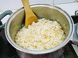 Arabic rice or rice with vermicelli (in Classical Arabic: ٱلْأَرُزُّ بِٱلشُّعَيْرِيَّةِ; Al-Aruzz bi-sh-shu'ayriyyat) is a traditional preparation of rice in the Middle East, a variant of the simpler cooked rice recipe, but adding lightly toasted vermicelli (tiny noodles). The rice cooking method is known as pilaf,[1] by which the rice is fluffy, light and does not stick. Traditionally, a long-grain rice, such as basmati or jasmine, is used,[1] although short-grain rice, such as bomba or Misri ("Egyptian"), can be used too. Brown rice can also be used.[2]