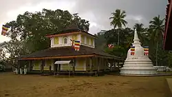 The temple consists mainly of a Stupa, image house, sacred Bodhi Tree, Dhamma discourse hall and Bhikku dwellings. The image house consists of Kotte era paintings and is built using 27 carved rock pillars. Inside the most inner chamber of the image house is the main Samadhi Buddha statue with other related statues and paintings. The inner chamber is entered with a carved stone door frame (Gal Uluhau) and the corners of the building have been strengthened using stone columns. The Bodhi Tree of the Vihara which is believed to be one of 32 saplings of Jaya Sri Maha Bodhi, has been identified as the largest Bodhi tree among the 32 Bodhis that are found in the island.[6]
