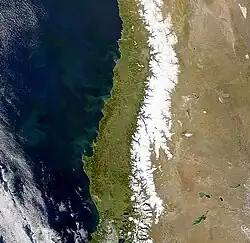 The Arauco Basin (Spanish: Cuenca de Arauco) is a sediment-filled depression –a sedimentary basin– in south-central Chile. In the context of plate tectonics it is classified as a forearc basin. The basin has an approximate area of 8,000 square kilometres (3,100 sq mi) and at its deeper parts the surface of its sedimentary fill reaches 200 metres (660 ft) below sea-level.[1] The basin is interpreted as being part of an uplifted part of the continental shelf.[2] To the west it bounds an active accretionary prism that lies next to the Chile trench and to the east it bounds metamorphic basement representing a fossil Paleozoic accretionary complex that has been intruded by the Coastal Batholith of central Chile.[3]