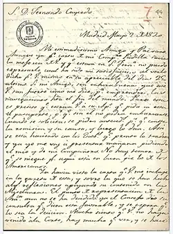Letter from the Independence fighter Antonio Arboleda y Arrachea addressed from his exile in Madrid to the priest Fernando Caicedo y Flórez, in 1820. (Cipriano Rodríguez Santamaría Historical Archive, University of La Sabana, Chía).