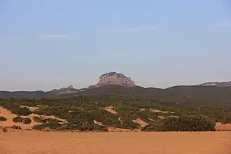 Located about 60 kilometres (37 miles) northwestward of Cagliari along the southwestern coastline, Arbus' region, from a geological point of view, is dominated by low-grade metamorphics intruded, in late-Variscan times, by granodioritic and leucogranitic magmas forming the so-called "Arbus igneous pluton". This pluton emplaced at 304 ± 1 Ma (U-Pb dating on zircons), along a thrust surface separating a pile of allochthonous tectonic units from the Foreland. This age, inside the correlated error, is undistinguishable from 305 ± 13 Ma obtained with Rb/Sr isochron for granodiorites. Remarkably, in the wide compositional spectrum of late-Variscan magmatism from Sardinia, the Arbus intrusives are quite distinctive. Indeed, granodiorites contain orthopyroxene and clinopyroxene in addition to ubiquitous dark mica, while leucogranites show often sub-vertical centimetric cloths of Fe-cordierite with quartz intergrowths or greenish to bluish tourmaline. Arbus is known for its coastline, known as Costa Verde. For both 2002 and 2003, the wide Arbus coasts were awarded "5 sails" by the Legambiente and Touring Club. Beaches include, from north to south, Capo Frasca, Pistis, Torre dei Corsari, Porto Palma, Babari, Funtanazza, Gutturu Flumini (Marina di Arbus), Portu Maga, Piscinas, Scivu and Capo Pecora.[47][48]